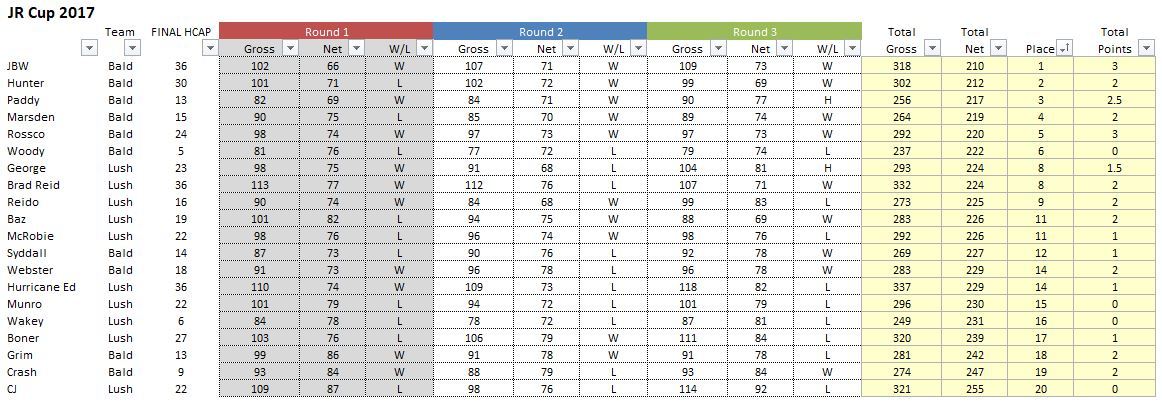 Some say the worst tag-line ever, but that didn't stop the baldies absolutely dealing to their more folically endowed competition. Three baldies went undefeated through the competition (JWB, Patty & Rosco) whereas the lagging lushers had three who failed to score a solitary point (Wakey, Munro & CJ). A winning margin like that may never be repeated and rest assured the baldies let the opposition know it.